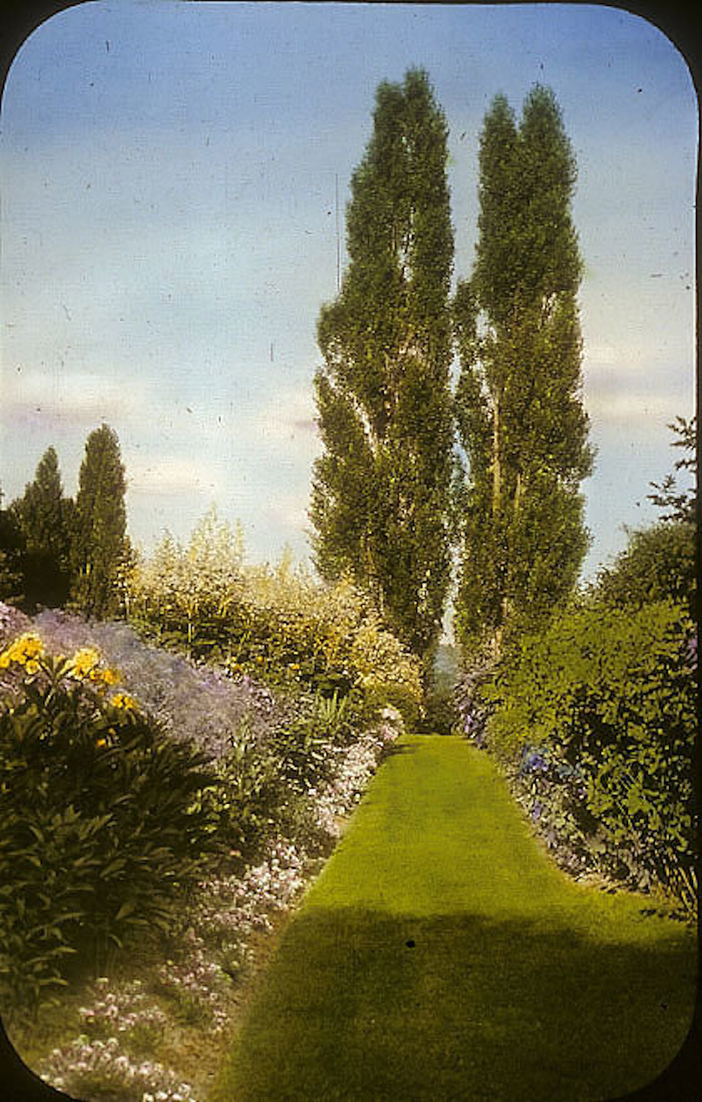 Color glass lantern slide depicting grass pathway, flowers, and shrubs on the property of J.J. Glessner. Courtesy of Smithsonian Institution, Archives of American Gardens, The Garden Club of America collection. {Vegetation - Circulation} [NH013001]