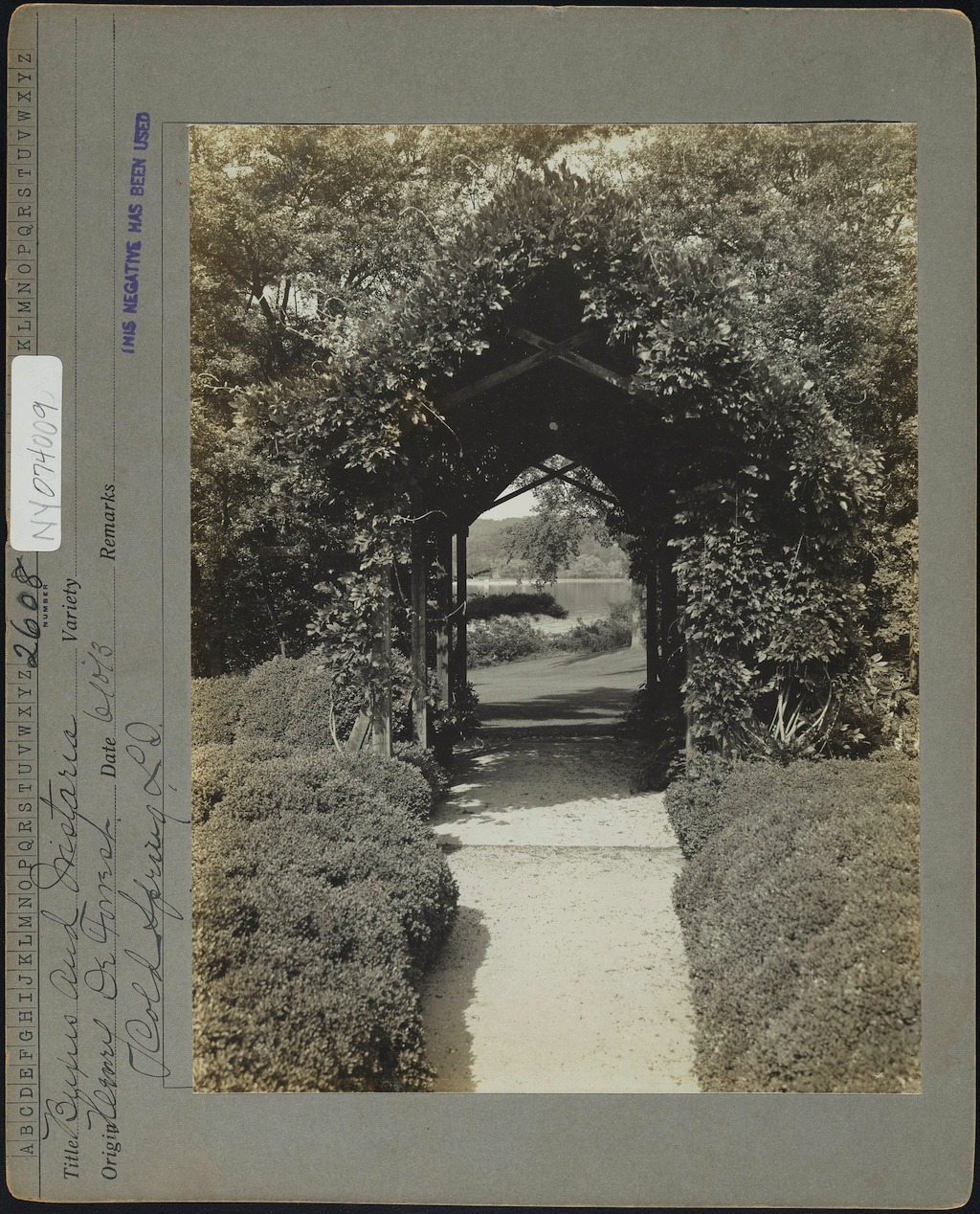 Black and white photographic print mounted on carboard showing the growth of a buxus hedge and instoria over a pergola and dirt pathway. Courtesy of Smithsonian Institution, Archives of American Gardens, J. Horace McFarland Company collection.. {Vegetation - Circulation - Structure} [NY074009]