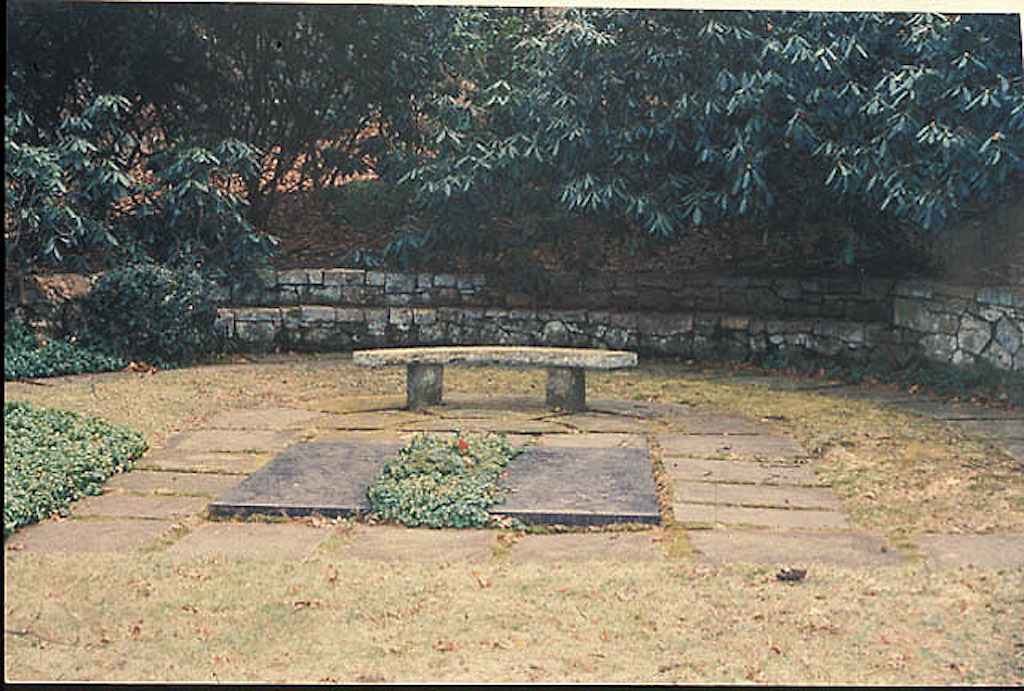 Colored slide depicting a burial plot, curved bench and low stone wall. Courtesy of Smithsonian Institution, Archives of American Gardens, The Garden Club of America collection. {Vegetation - Site Furnishing} [NY795008]