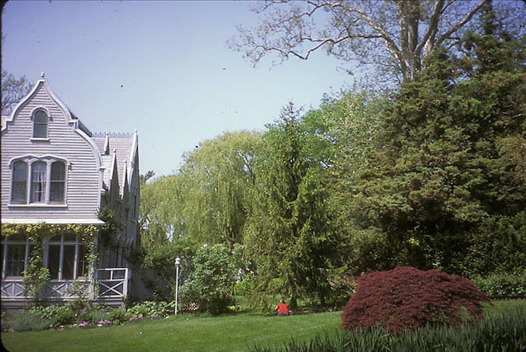 Color slide of Clifton, the home and property of J.M. Demarest. The photo depicts the house, lawn, and adjacent weeping maple and willow tree. Courtesy of Smithsonian Institution, Archives of American Gardens, The Garden Club of America collection. {Spatial Organization - Vegetation - Building} [NY300006]