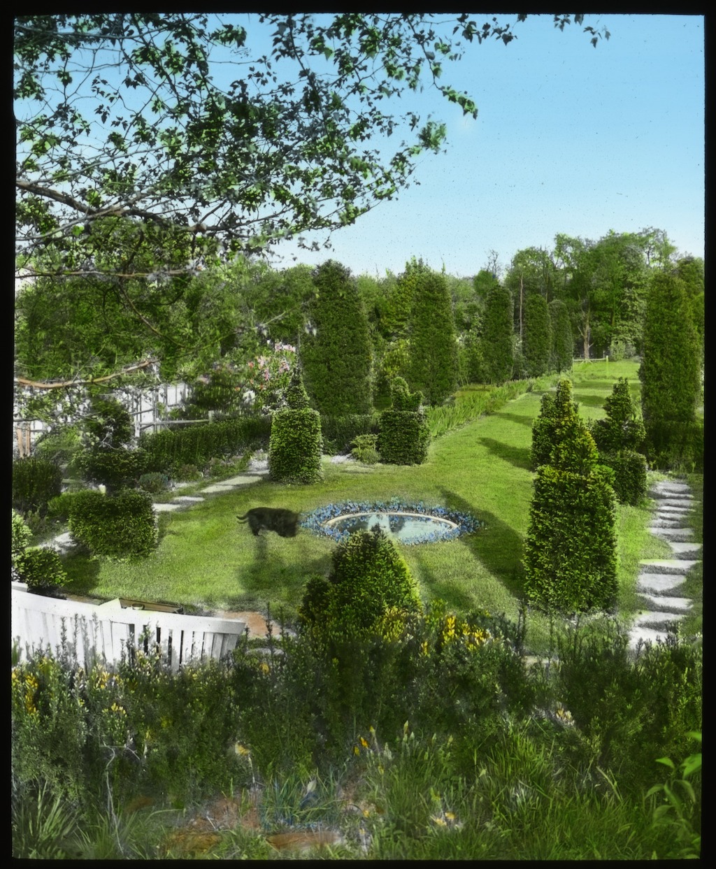 Hand-colored lantern slide of James A. Burden property in Syosset, N.Y showing topiaries, stepping stones, and green lawn. Courtesy of Smithsonian Institution, Archives of American Gardens, The Garden Club of America collection. {Spatial Organization - Topography - Vegetation - Water Feature - Site Furnishing} [NY090001]