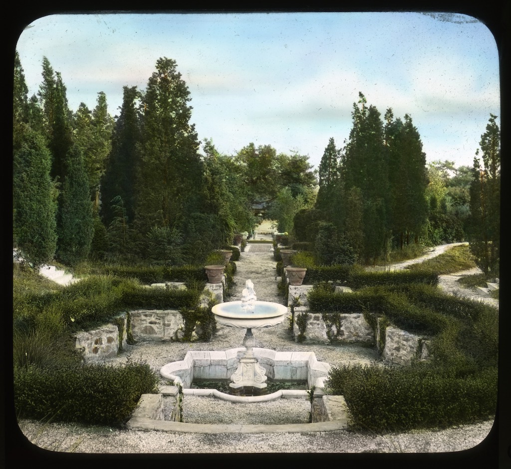Color glass lantern slide showing cedrus surrounding a stone pathway and central fountain on the grounds of Francis P. Garvan's estate. Courtesy of Smithsonian Institution, Archives of American Gardens, Historic Gardens Stereograph collection. {Spatial Organization - Vegetation - Circulation - Water Feature - Site Furnishing} [NY159002]