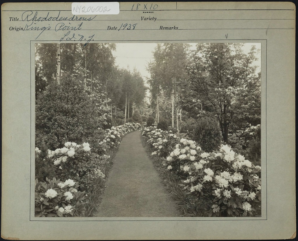 Black and white photographic print of a rhododendron-lined path on the private estate of H. H. Rogers. Courtesy of Smithsonian Institution, Archives of American Gardens, J. Horace McFarland Company collection. {Topography - Vegetation - Circulation} [NY206002]