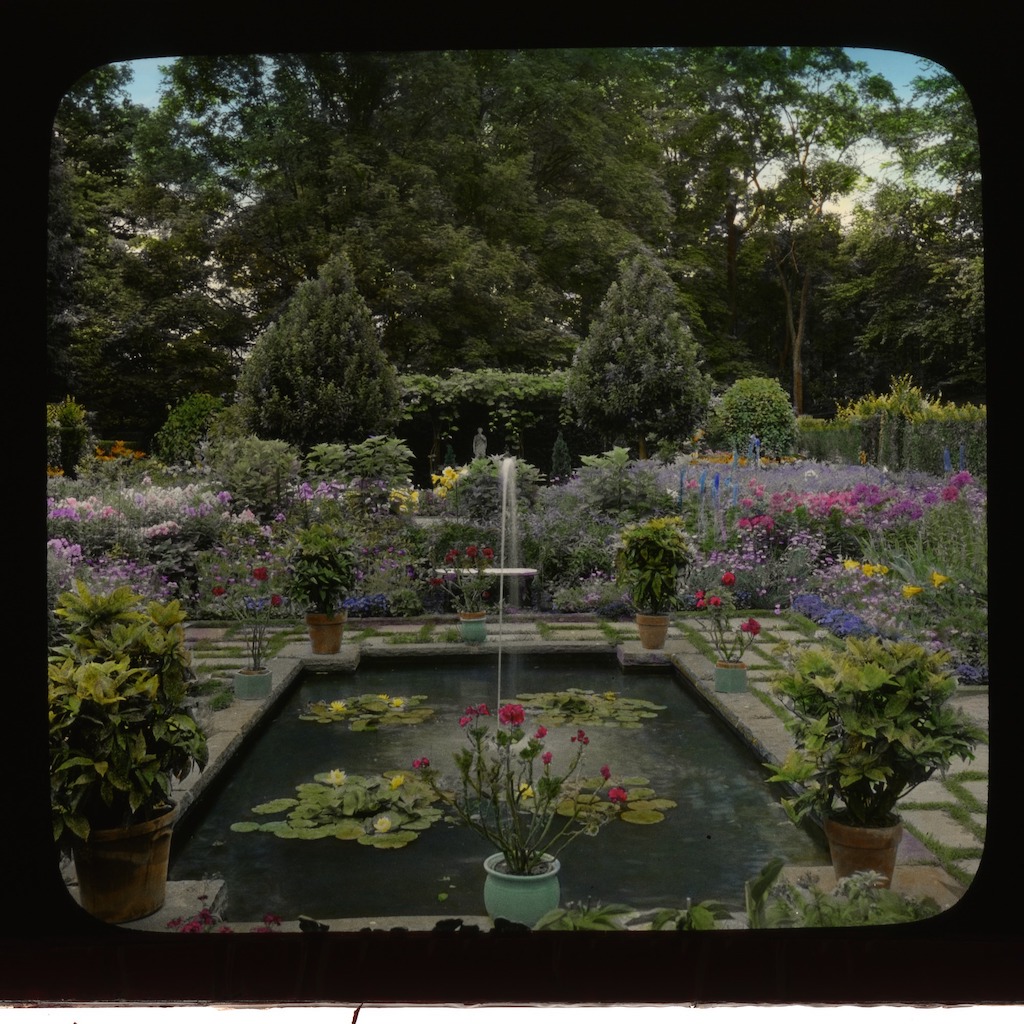 "Harbour Court". Hand-colored lantern slide. Courtesy of Smithsonian Institution, Archives of American Gardens, The Garden Club of America collection. {Vegetation - Water Feature} [RI028002]