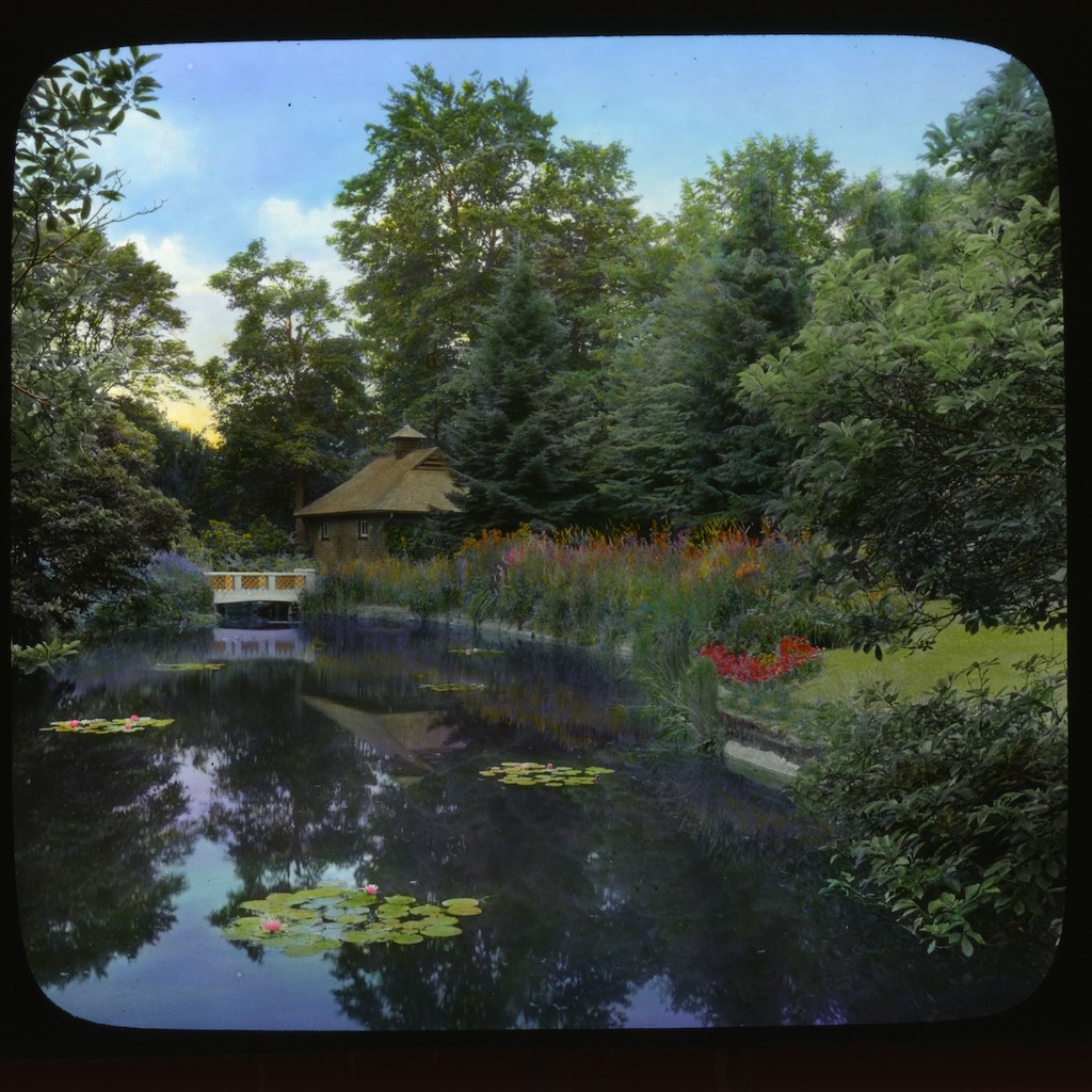 "Harbour Court" - pond. Hand-colored lantern slide. Courtesy of Smithsonian Institution, Archives of American Gardens, The Garden Club of America collection. {Vegetation - Water Feature - Structure - Building} [RI028001]