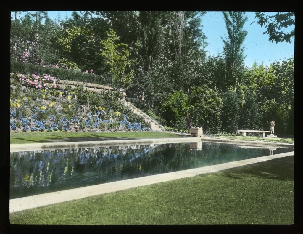 Hand-colored lantern slide of Mrs. Charles W. Stimson's garden, by Edward Van Altena. Courtesy of Smithsonian Institution, Archives of American Gardens, The Garden Club of America collection. {Vegetation - Water Feature - Site Furnishing} [WA004001]