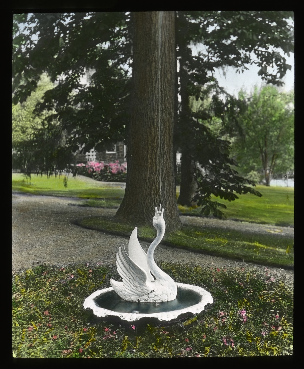 "White Swan" - garden fountain, dating from 1839 period, typical of Andrew Jackson Downing garden ornament. Hand-colored lantern slide. Courtesy of Smithsonian Institution, Archives of American Gardens, The Garden Club of America collection. {Vegetation - Site Furnishing} [RI008001]