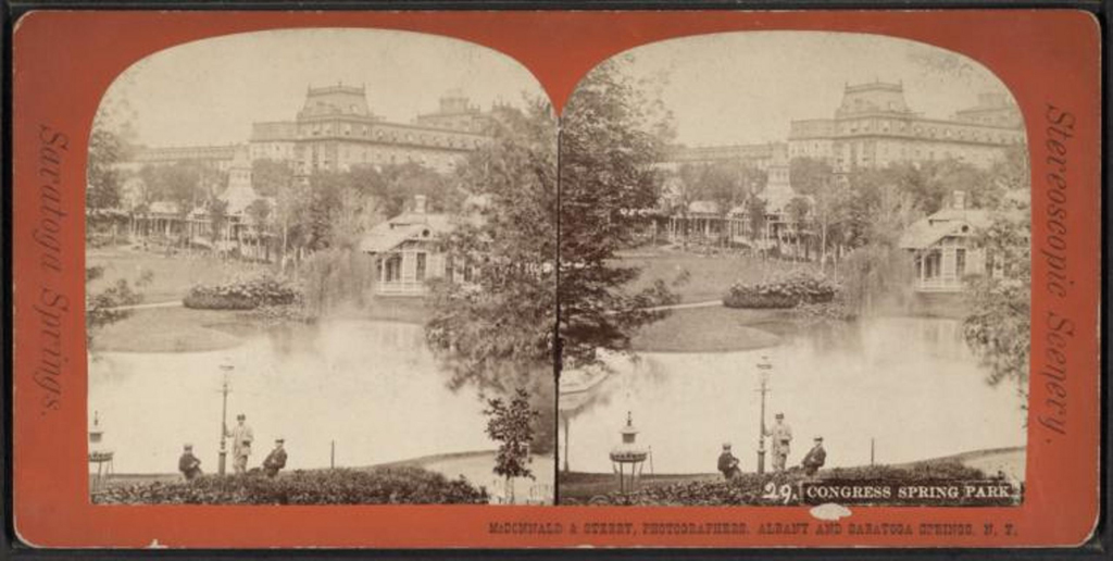 Stereoscopic view of Congress Spring Park. McDonnald & Sterry Photographers. Robert N. Dennis Collection of Stereoscopic Views at the New York Public Library. {Vegetation - Circulation - Water Feature}