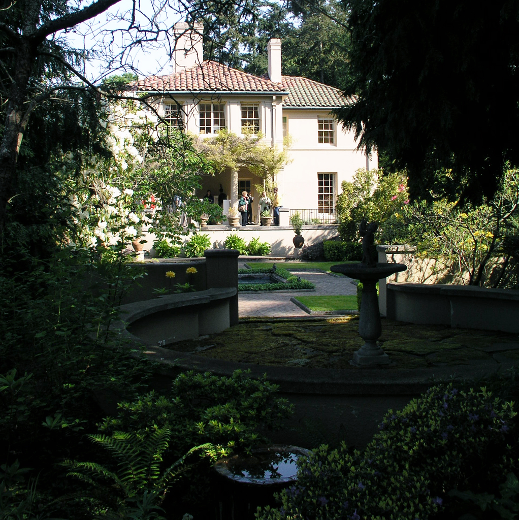 Ballinger house from location of pavillion in garden. {Spatial Organization - Vegetation - Water Feature - Structure - Building}